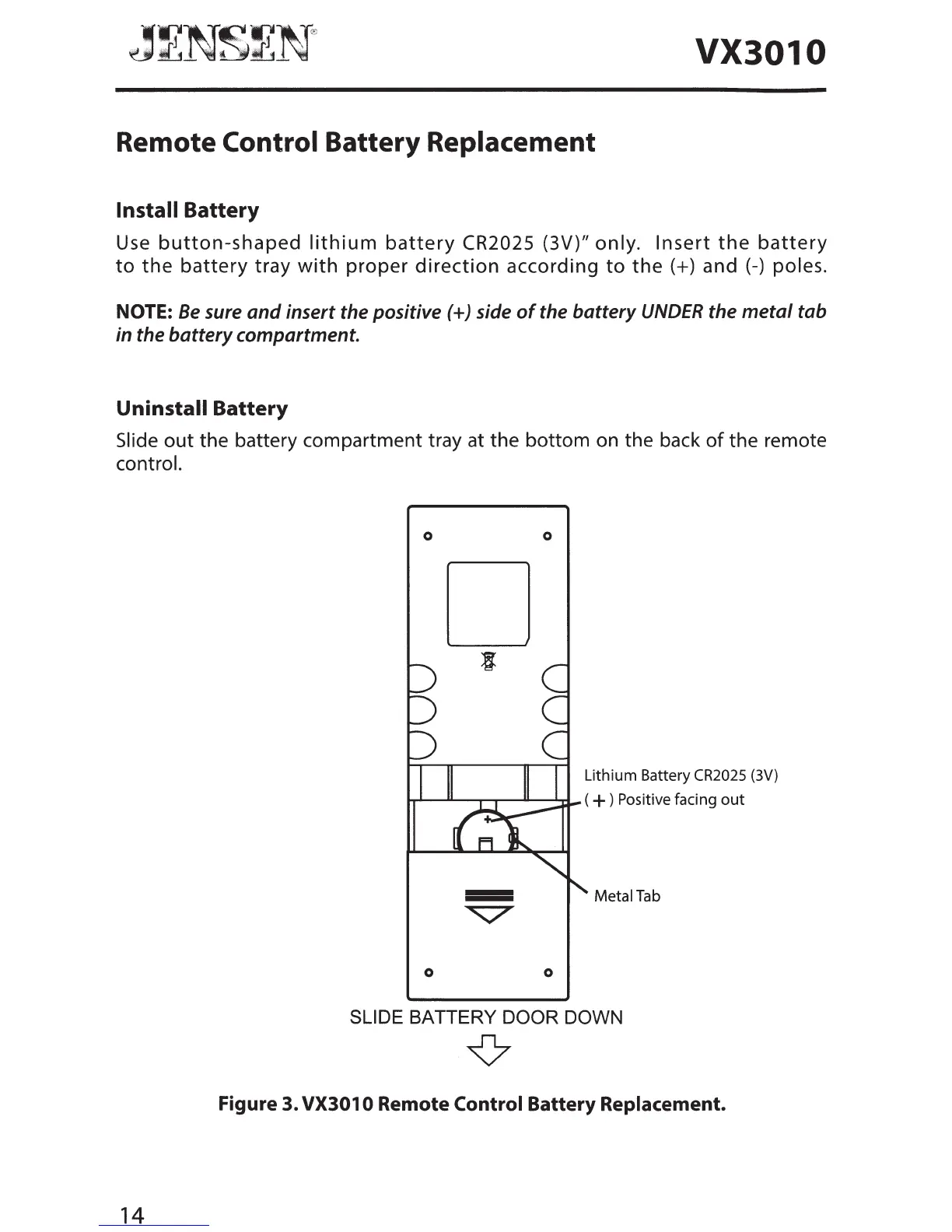 Jensen VX3010 - Remote Control Battery Replacement; Battery Installation and Removal; Battery Replacement Diagram