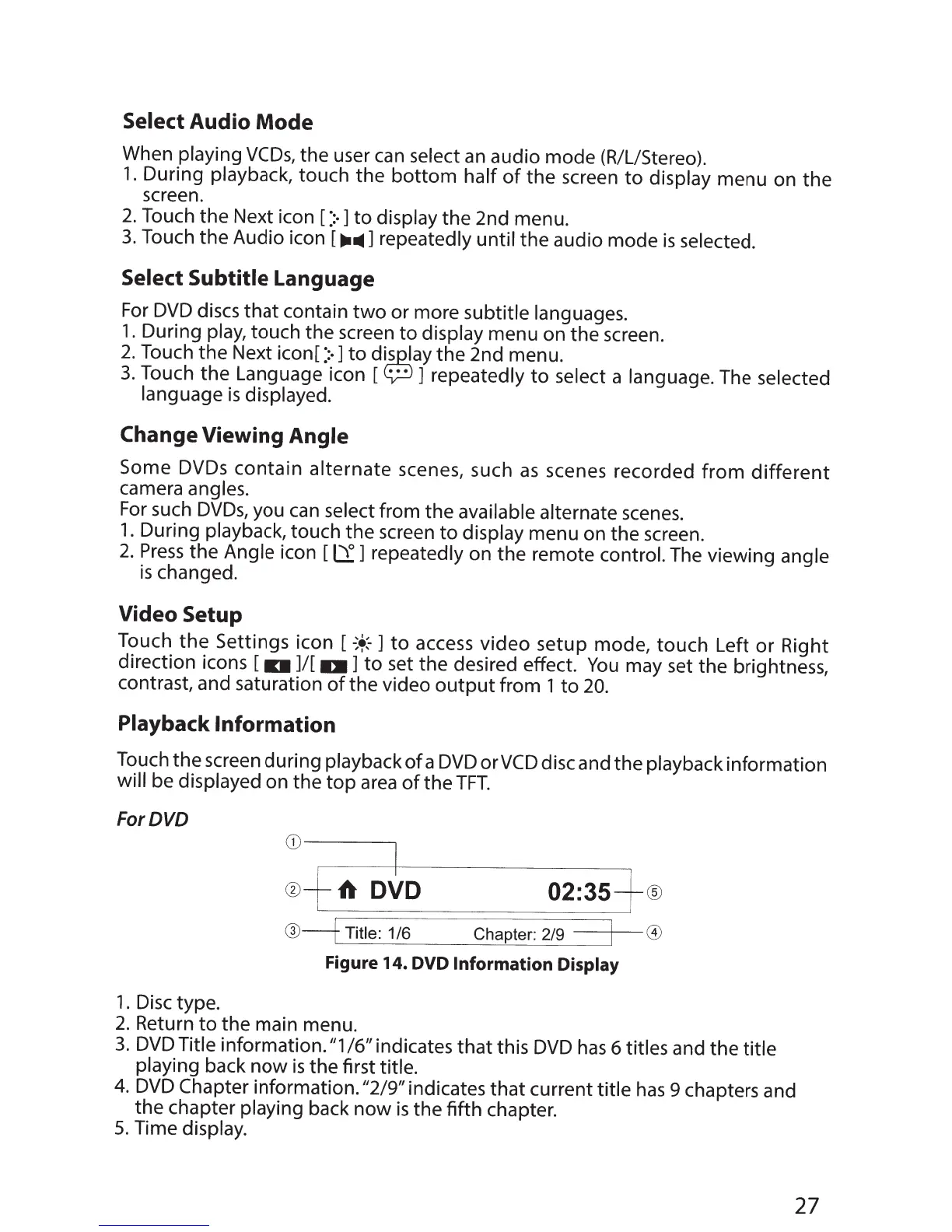Jensen VX3010 - Media Playback Options and Information; Audio, Subtitle, and Angle Selection; Video Setup Adjustments; DVD Playback Information Display