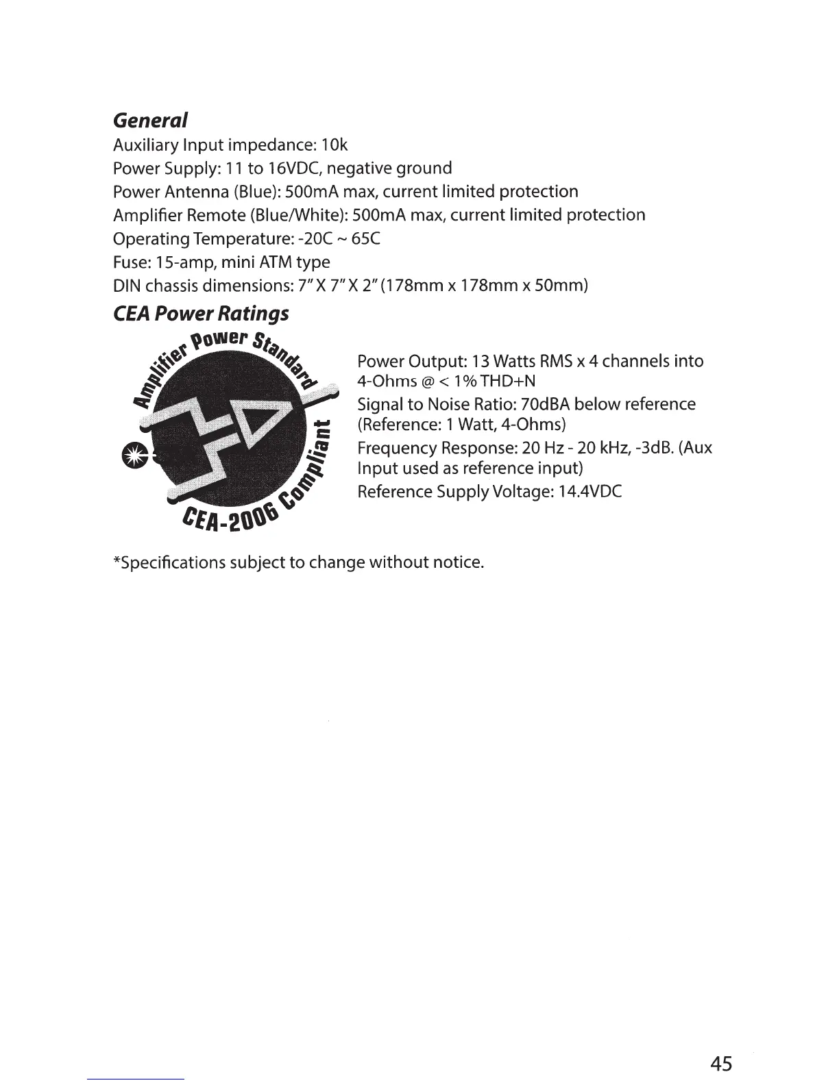 Jensen VX3010 - General and Power Specifications; General Electrical and Physical Specs; CEA Compliant Power Ratings