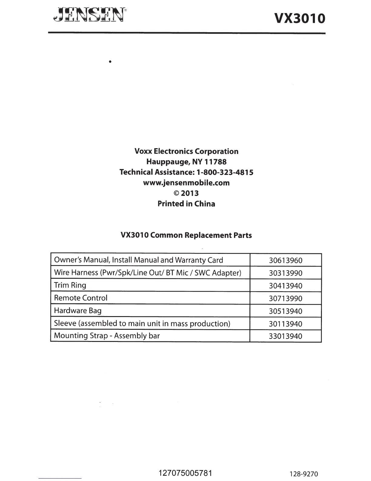 Jensen VX3010 - Replacement Parts Information; VX3010 Common Replacement Parts List