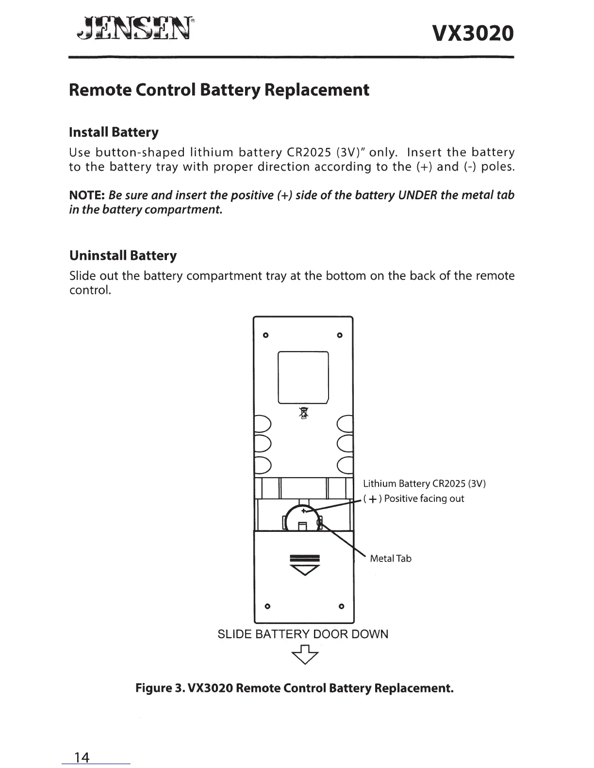 Jensen VX3020 - Remote Control Battery Replacement; Uninstall Battery