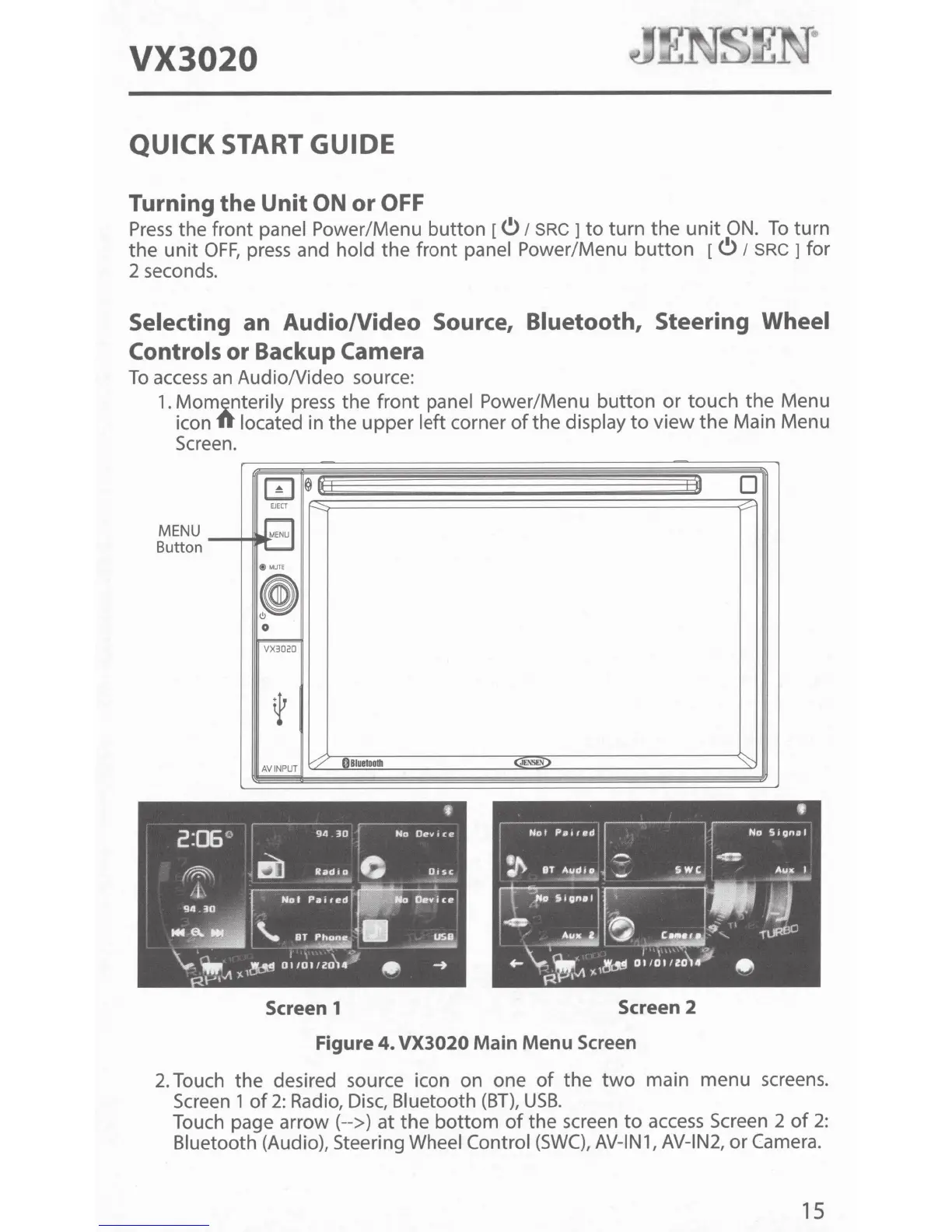 Jensen VX3020 - QUICK START GUIDE; Turning the Unit ON;OFF and Selecting Sources
