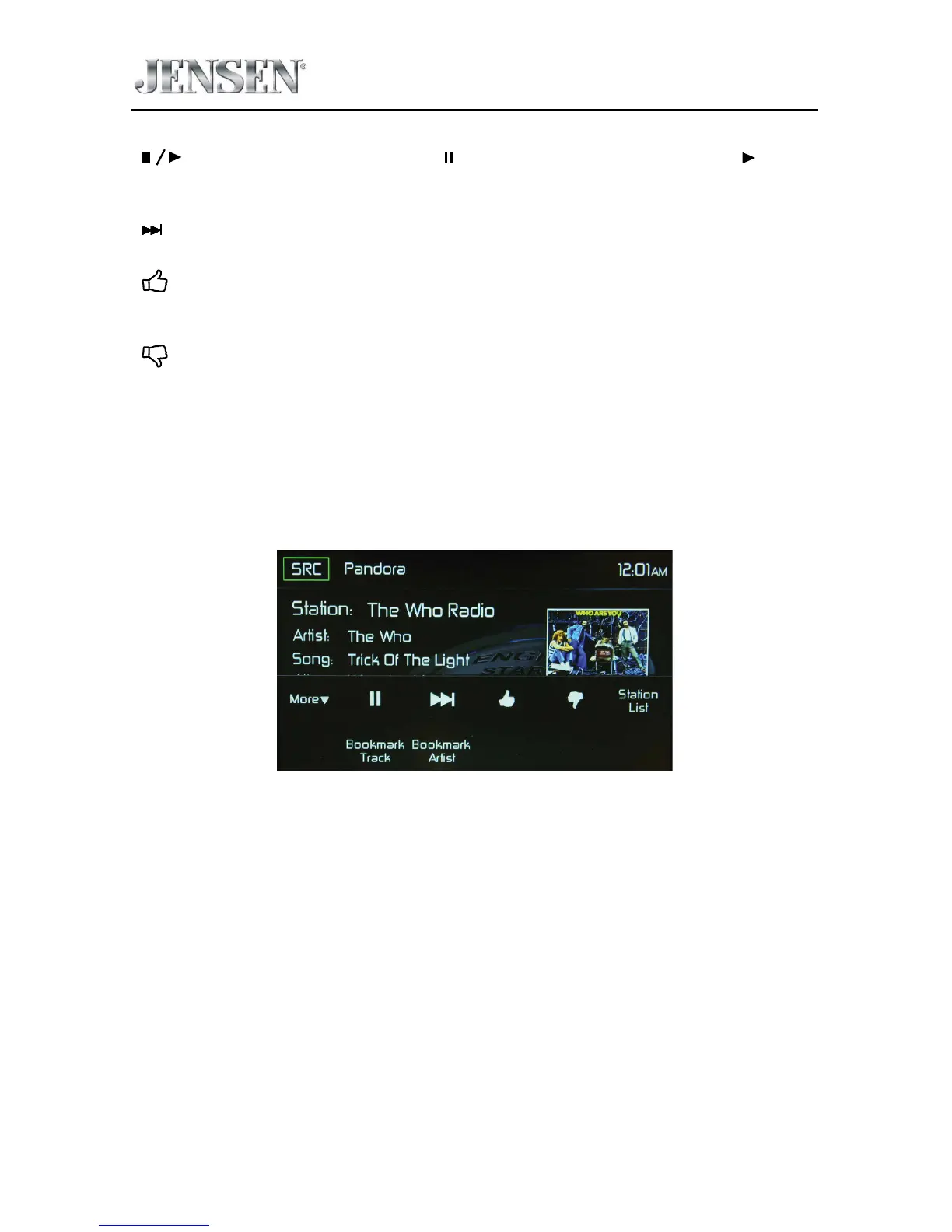 ) Thumbs Down - Press thumbs down to tell Pandora not to play this track.