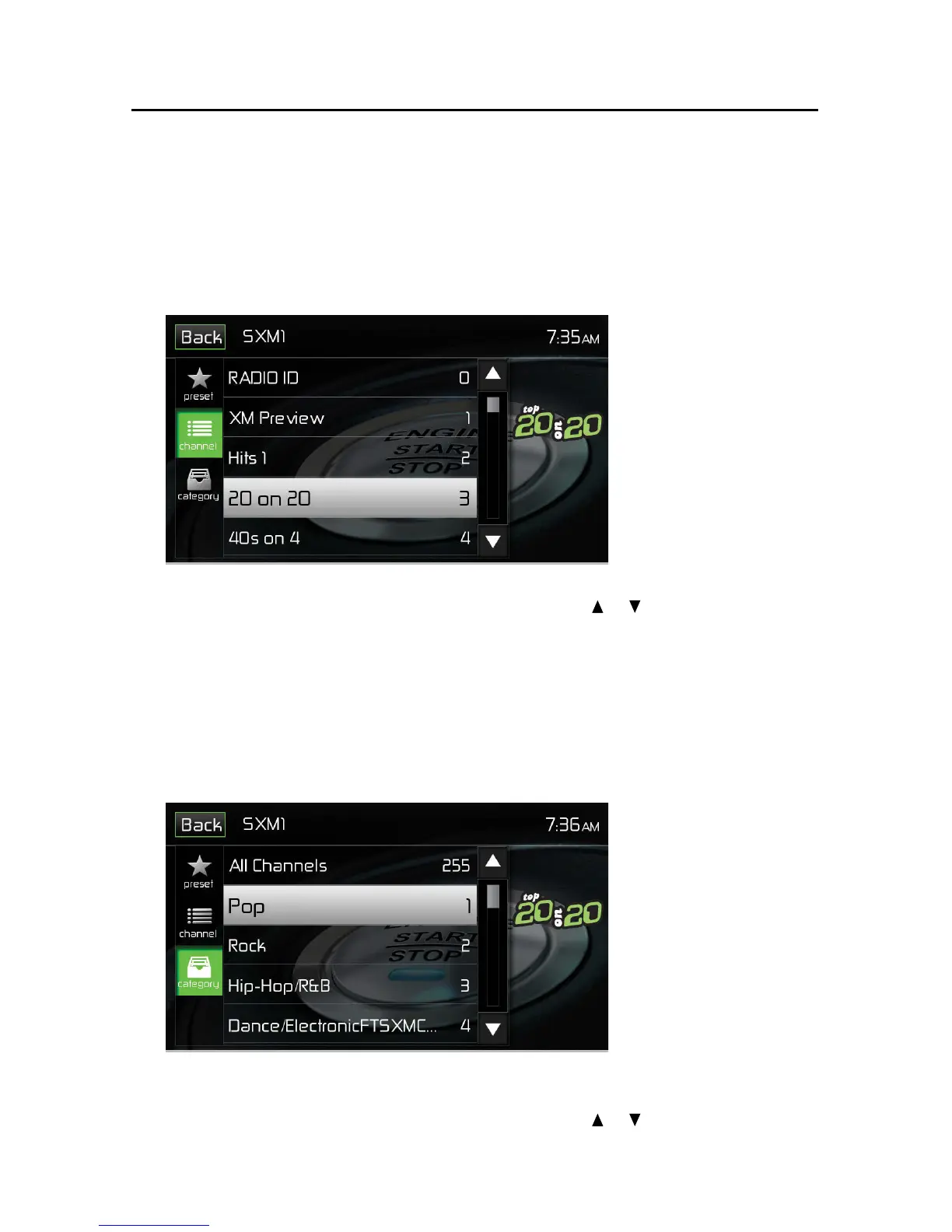 1. On the SirusXM® menu page 1, touch the Category/Channel icon (if needed)