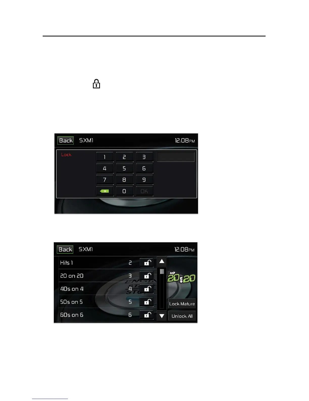 1. On the SirusXM® menu page 2, touch the Lock icon. The following screen