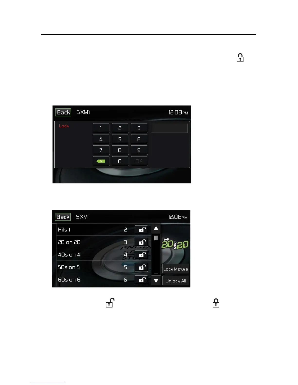 1. On the SirusXM® menu page 2, touch the Lock icon. The following screen