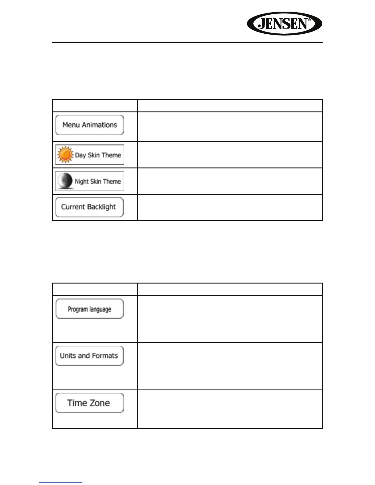 Display related settings include menu animations, separate skins for daytime and