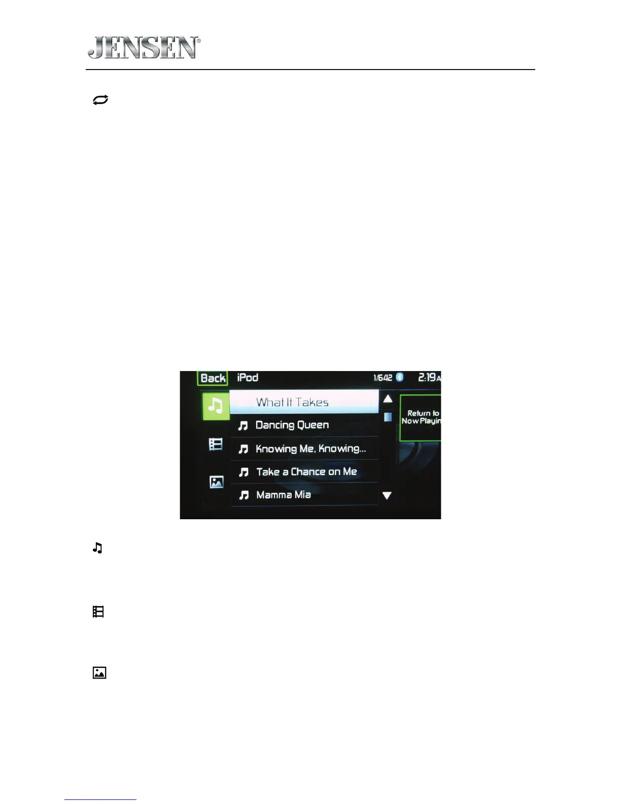 Touching the List icon will display the iPod® List Screen. The iPod® List Screen