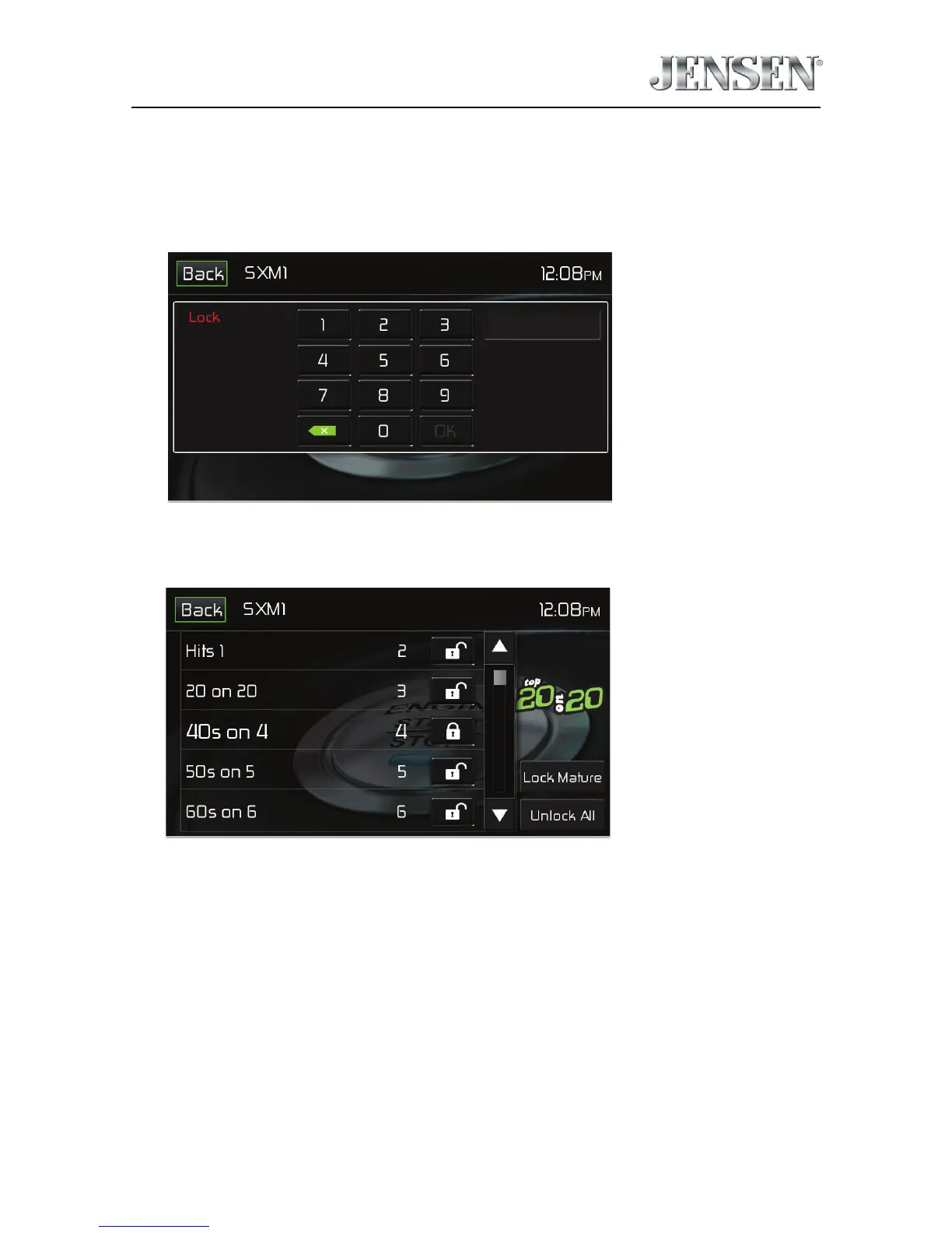 1. On the SirusXM® menu page 2, touch the Lock icon. The following screen