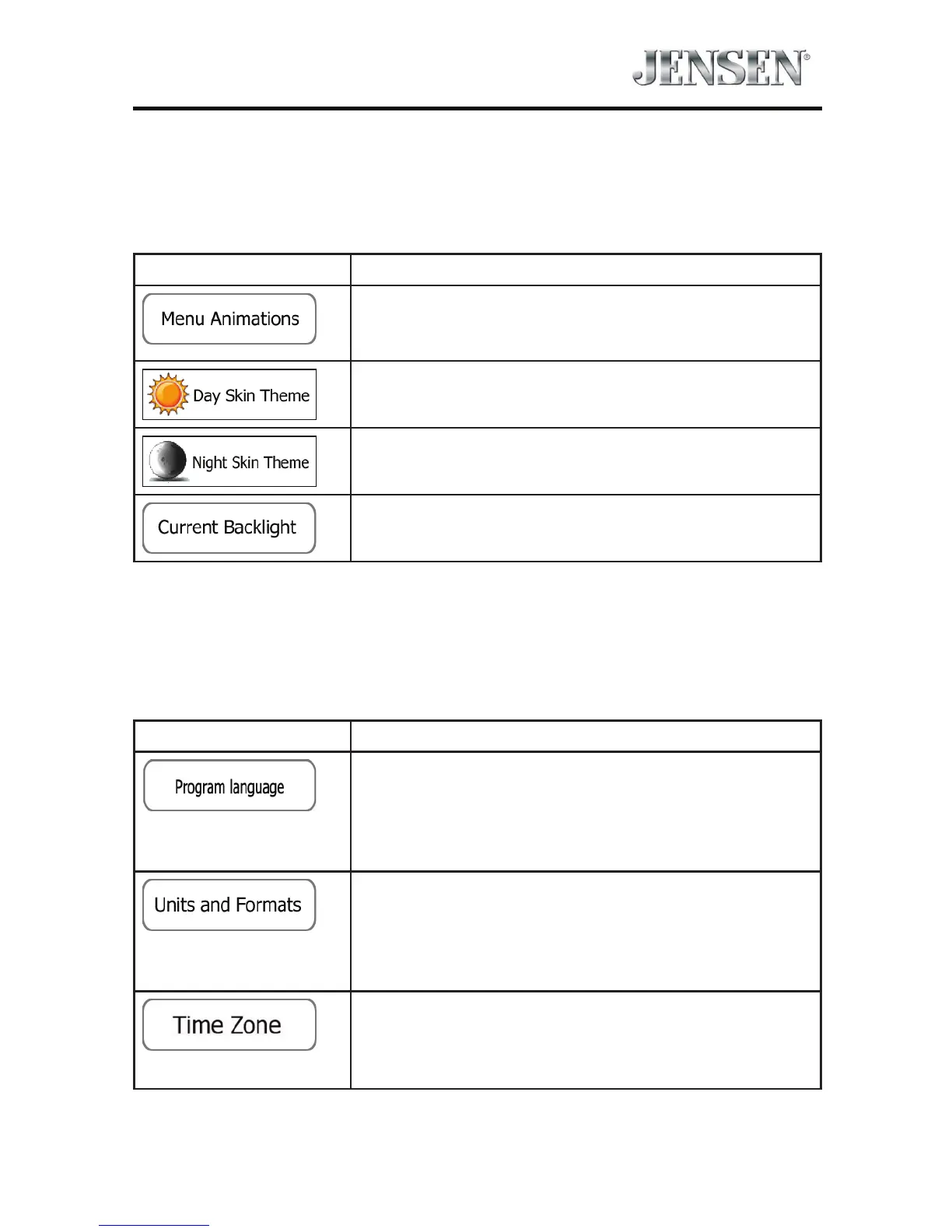 Display related settings include menu animations, separate skins for daytime and