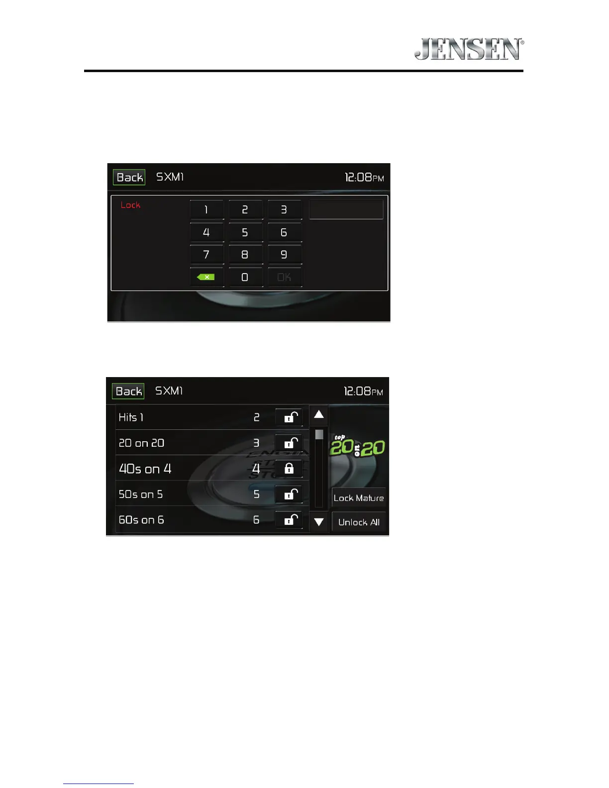 On the SirusXM® menu page 2, touch the Lock icon. The following screen