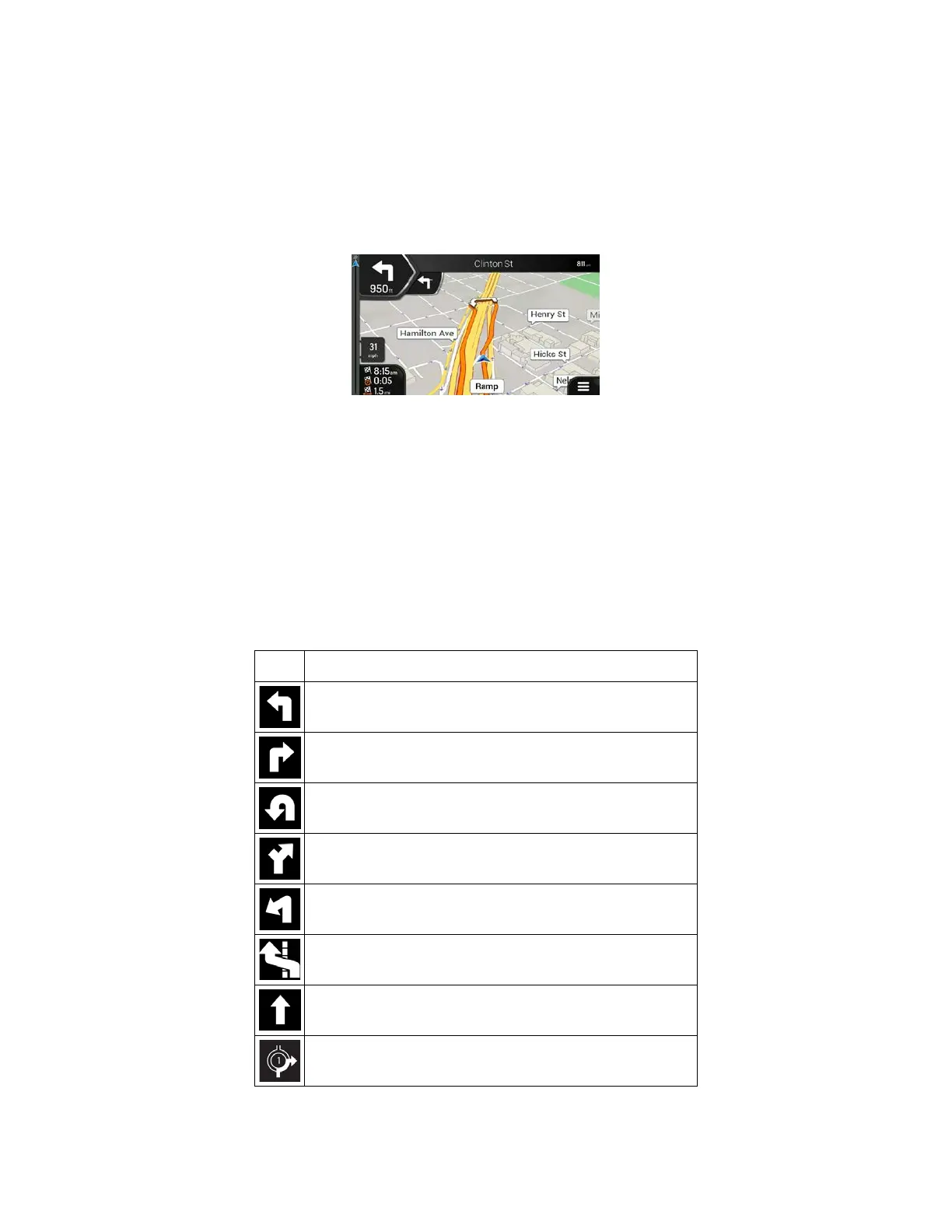 During navigation the next maneuver is displayed in the top left corner. Most of the maneuver icons are