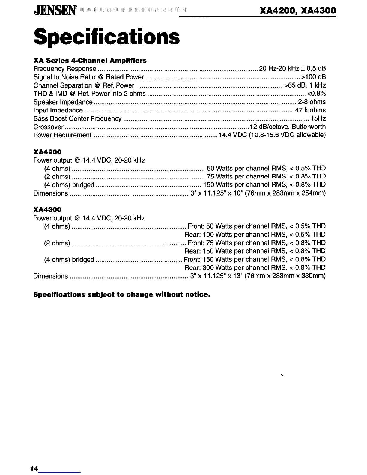 Power output @ 14.4 VDC, 20-20 kHz