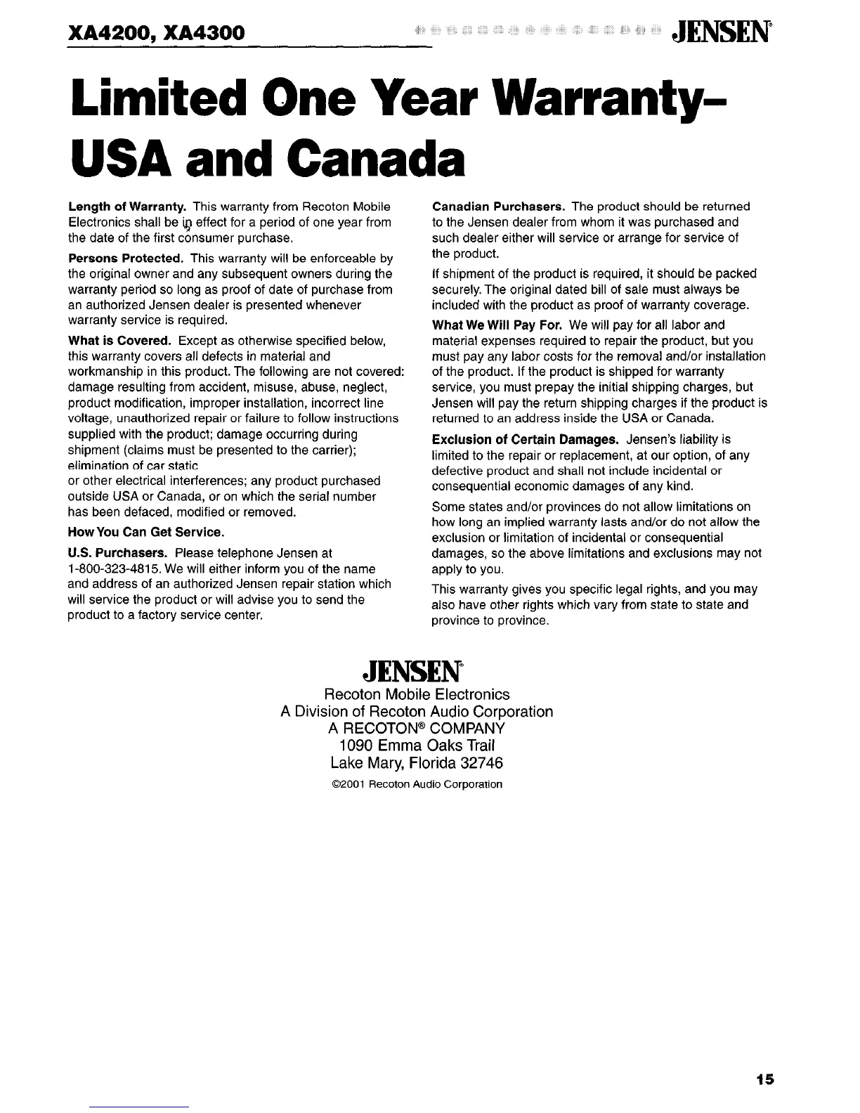 an authorized Jensen dealer is presented whenever