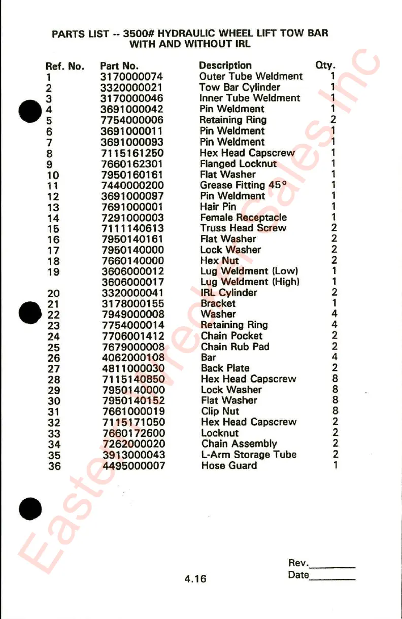 PARTS LIST -- 3500# HYDRAULIC WHEEL LIFT TOW BAR