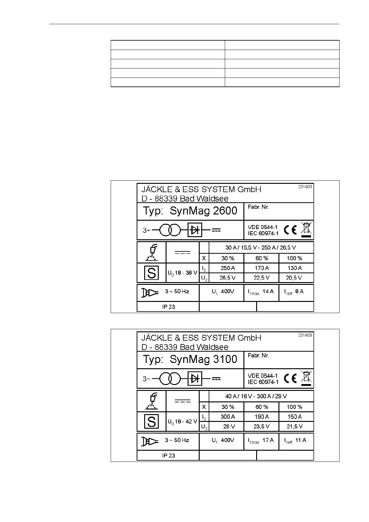 The welding power source is labelled by means of a nameplate on the housing as follows: