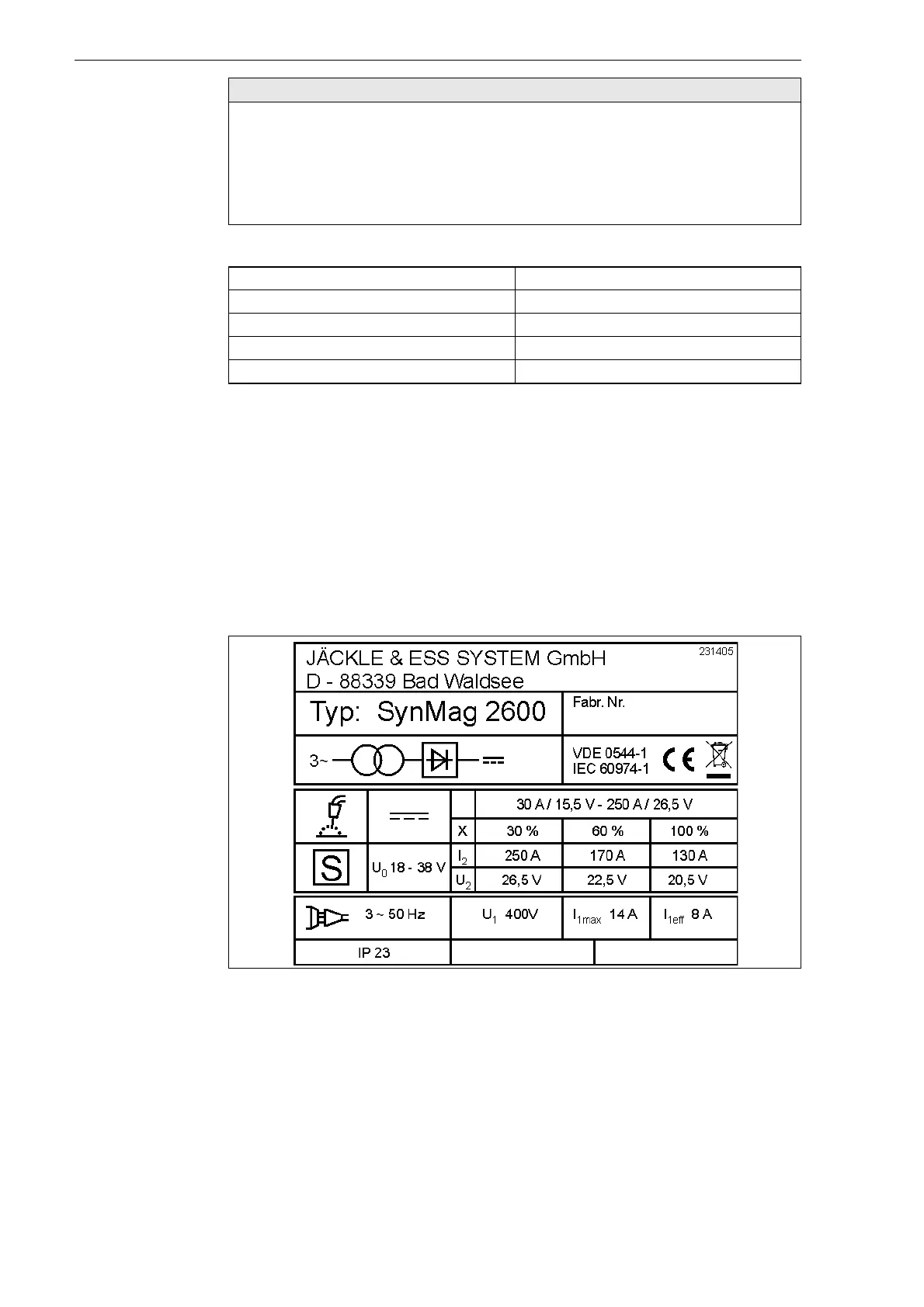 Die Schweißstromquelle ist am Gehäuse mit einem Typenschild wie folgt gekennzeichnet: