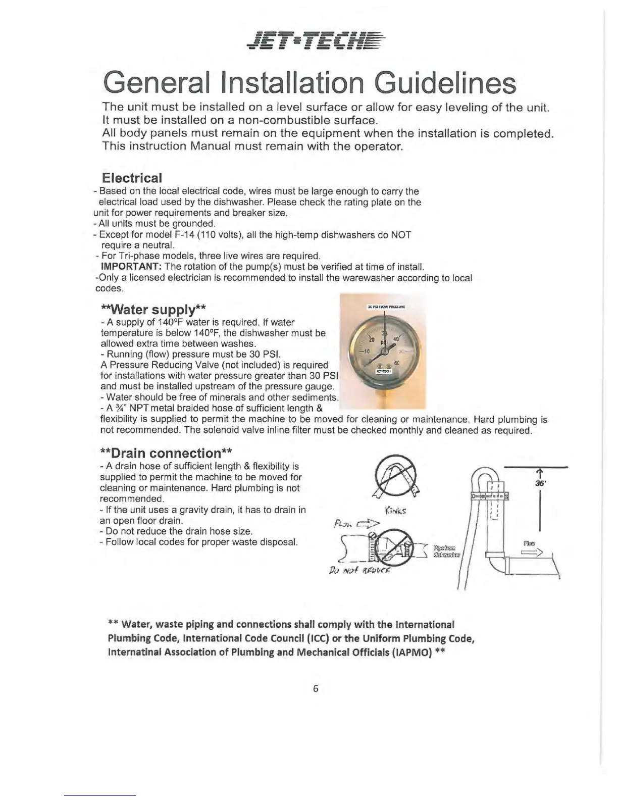Jet-tech 737E - General Installation Guidelines; Electrical Requirements; Water Supply; Drain Connection