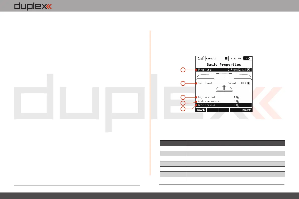 In this menu you will setup the wing configuration, tail type,