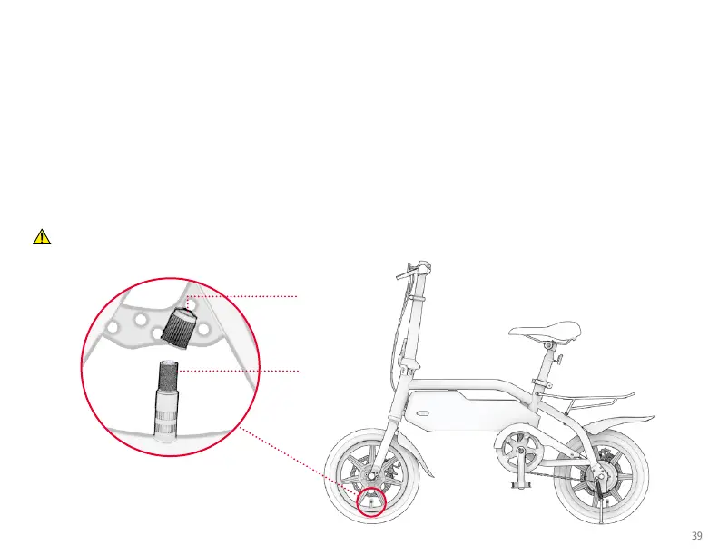 IMPORTANT: ONLY USE A MANUAL AIR PUMP TO INFLATE THE TIRES ON YOUR E-BIKE. NEVER USE AN AIR COMPRESSOR;