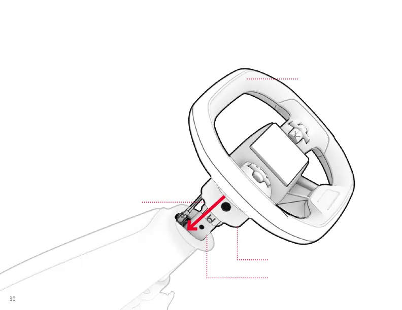 6. TUCK THE WIRES INTO THE CAVITY OF THE STEERING WHEEL (F) STEM, AND SLIDE THE STEM ONTO THE STEERING ROD (E).