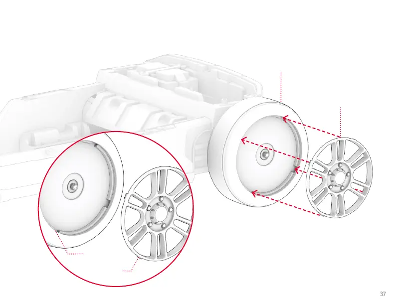 11. LEADING WITH 4 TABS ON THE HUBCAP, CLICK 1 REAR HUBCAP (I) ONTO EACH REAR WHEEL BY INSERTING THE TABS INTO