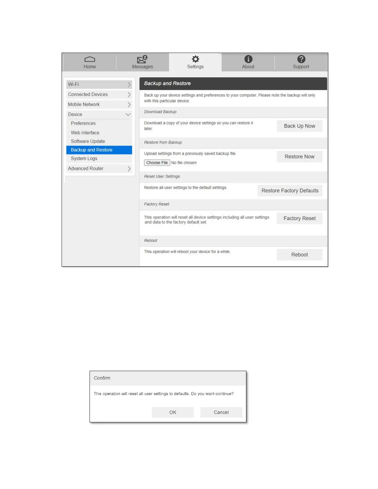 - Restore from Backup: To restore the device settings from the backup file, follow the