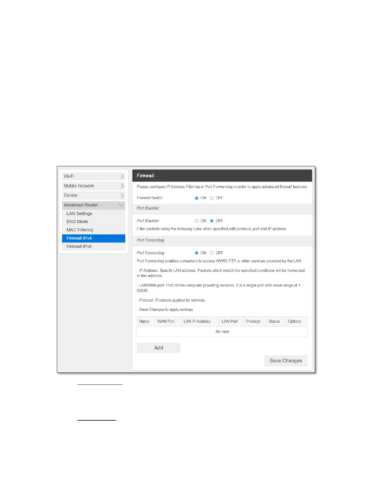 - Firewall Switch – To set up Port Blacklist and Port Forwarding, turn Firewall Switch