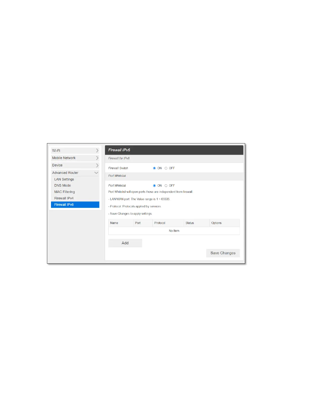 OFF, Port Whitelist settings is not active. By default, the Firewall Switch for IPv6 is ON to
