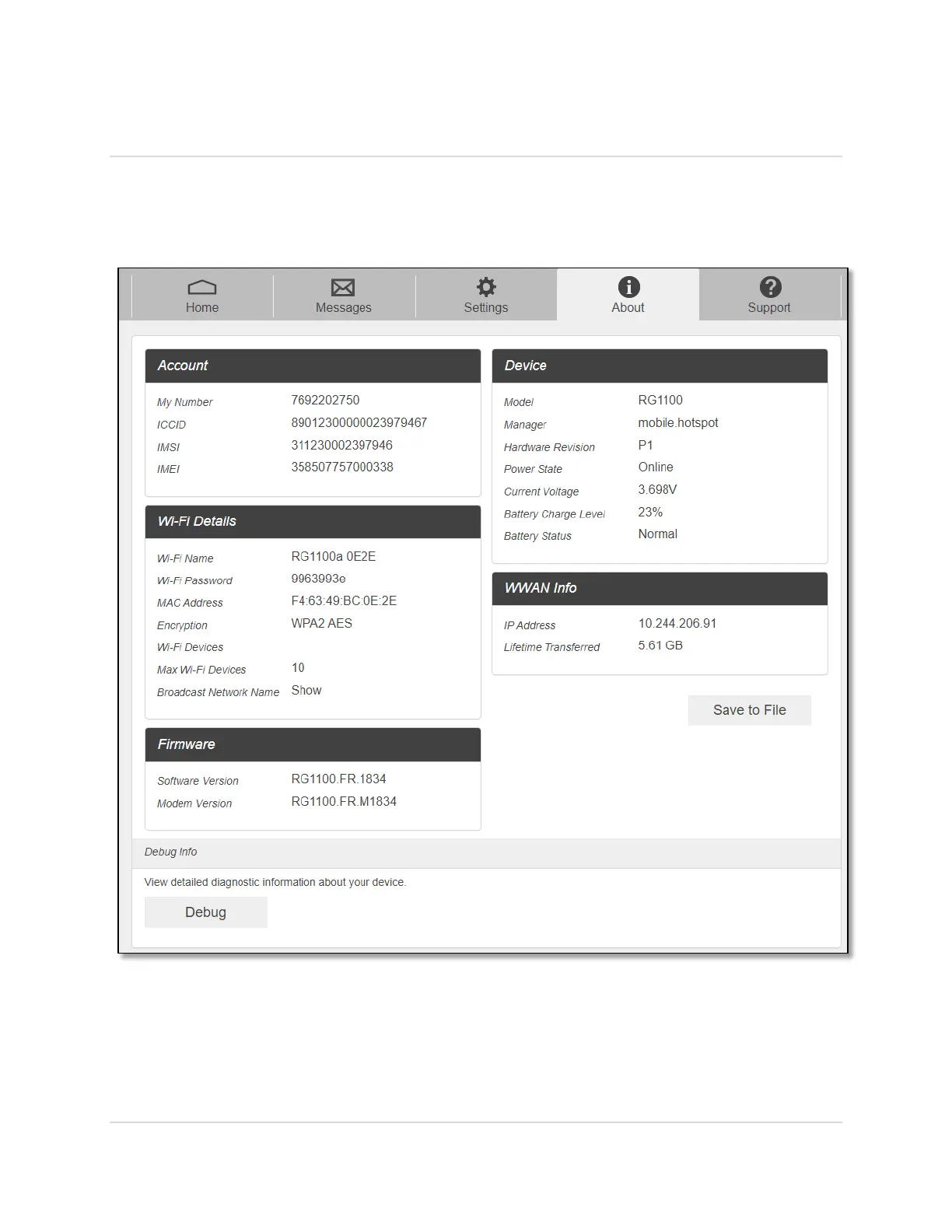 View your device's connection information, firmware information, WWAN information, Wi-Fi