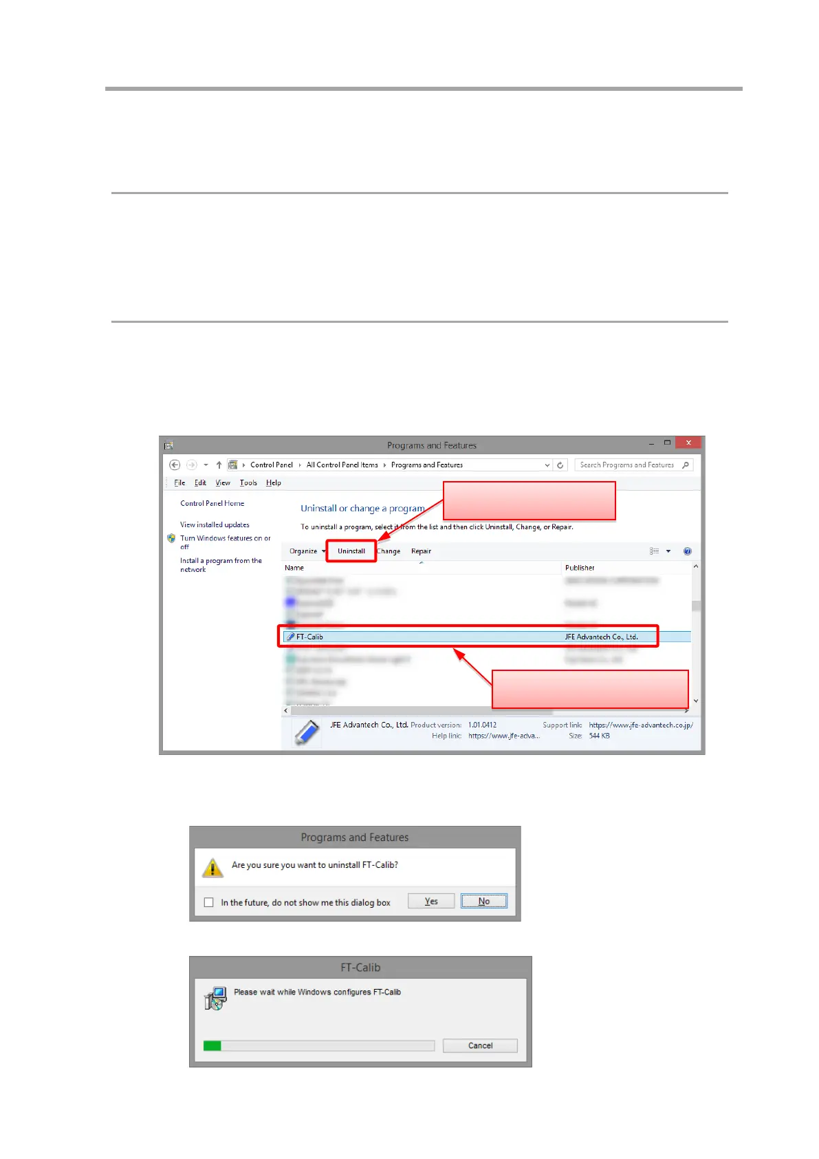 ① From the Start Menu, select [All Programs > JFE Advantech > FT-Calib] and click [Uninstall].