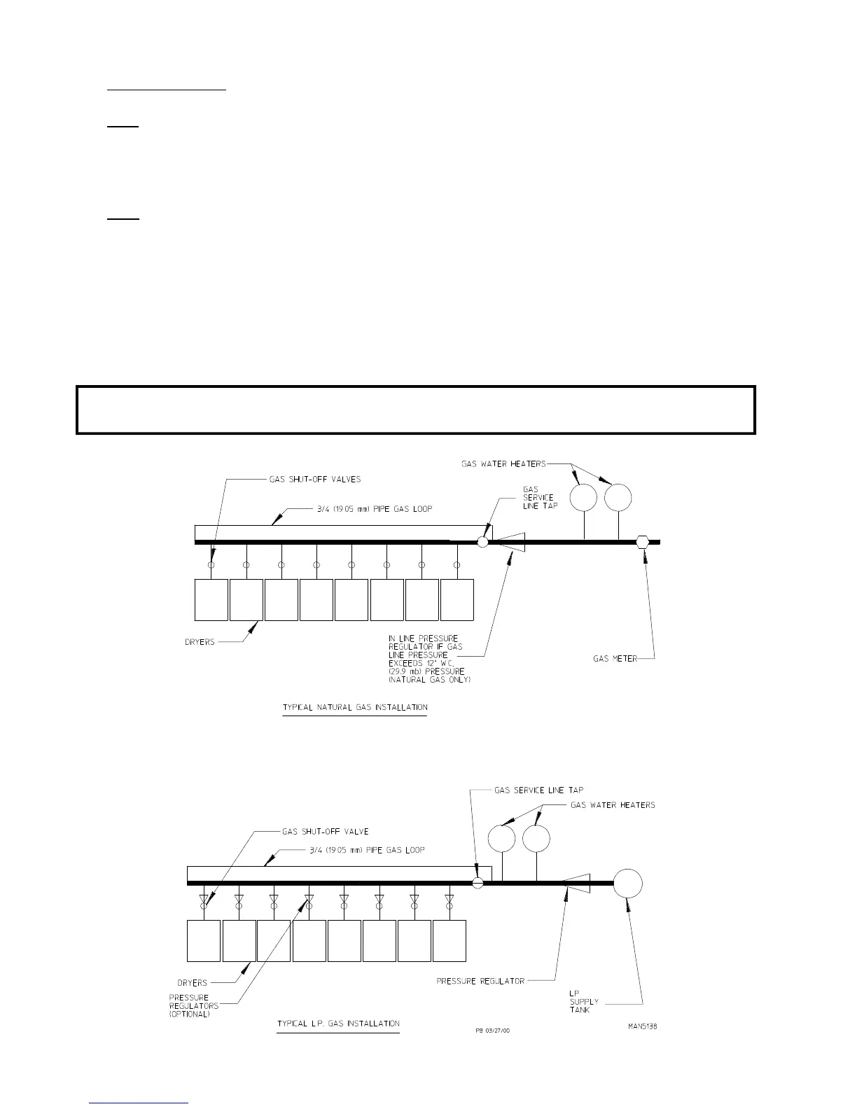 box. The minimum pipe size (supply line) to the dryer is 1/2” N.P.T. For ease in servicing, the gas supply