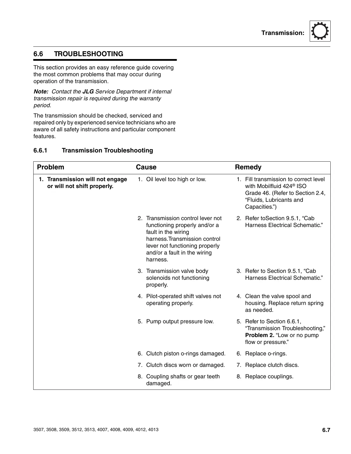 5. Pump output pressure low. 5. Refer to Section 6.6.1,