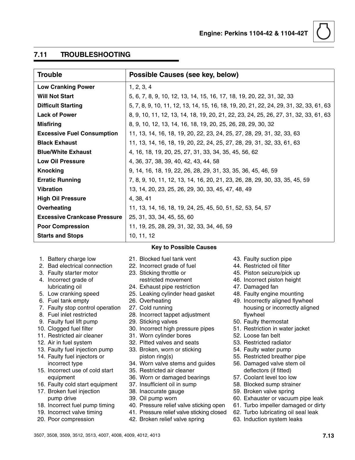 Trouble Possible Causes (see key, below)