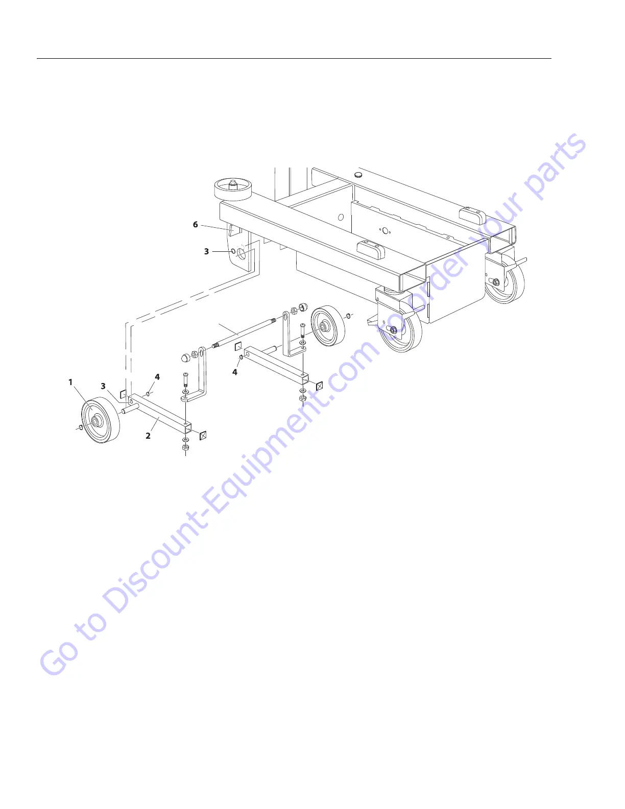 platform fully lowered. Or the frame stop weldment (6) doesn’t engage the wheel (1) at all, when the platform is elevated.