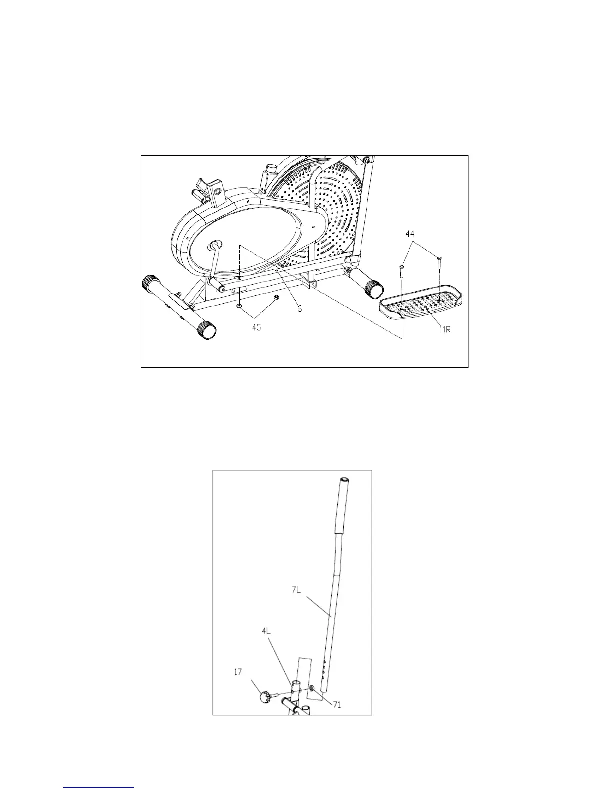 Tighten the Pedal (11L/R) to the Pedal Support (6 L/R) with Hexagon Bolt(44) and Nylon Nut