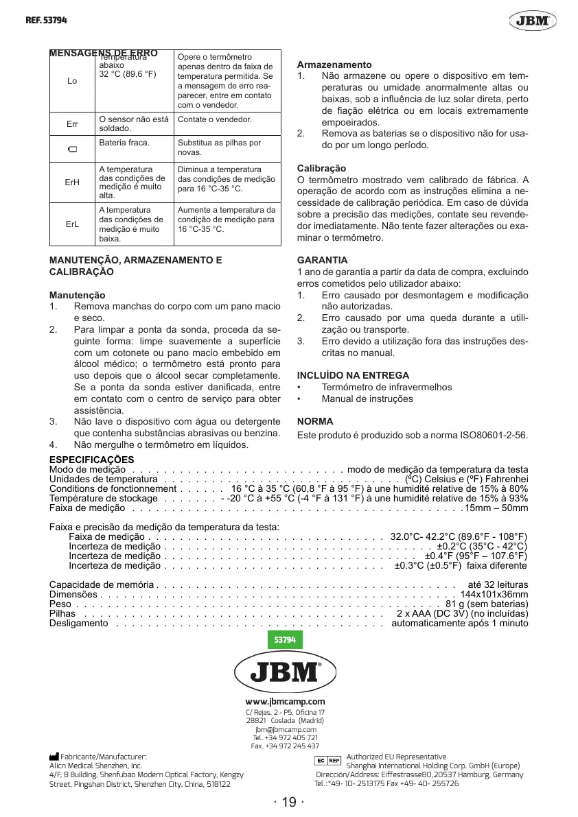 Incerteza de medição . . . . . . . . . . . . . . . . . . . . . . . . . . . . . . . . . . ±0.2°C (35°C - 42°C)