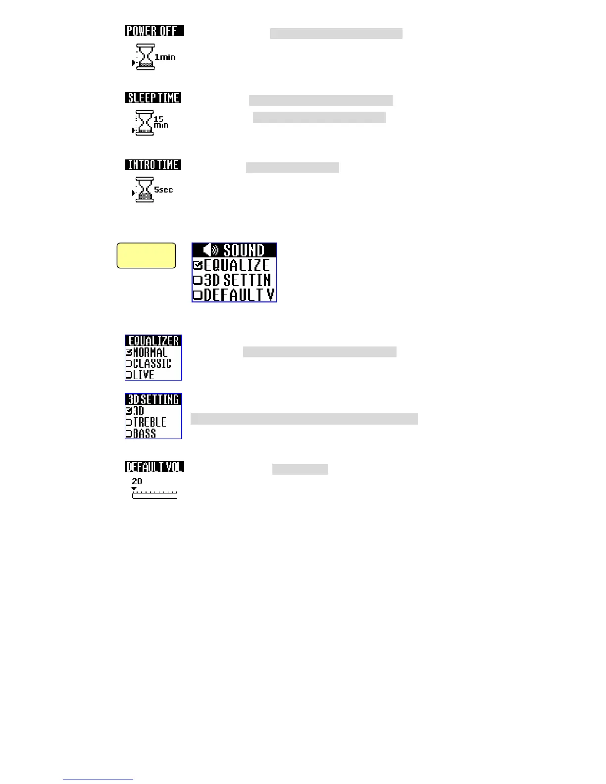 THIS MENU HAS EQUALIZER, 3D SETTING, DEFAULT VOLUME.