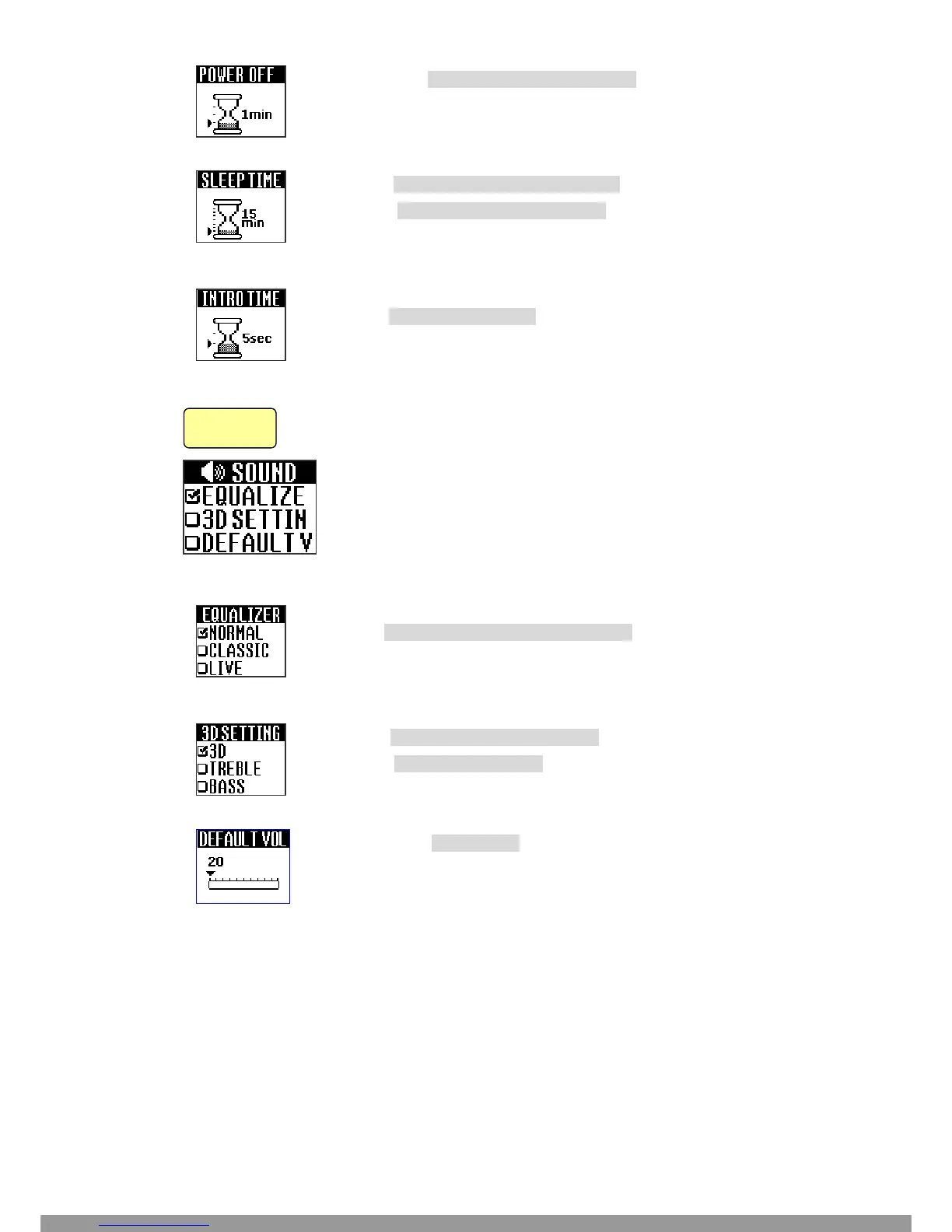 THIS MENU HAS EQUALIZER, 3DSETTING, DEFAULT VOLUME.