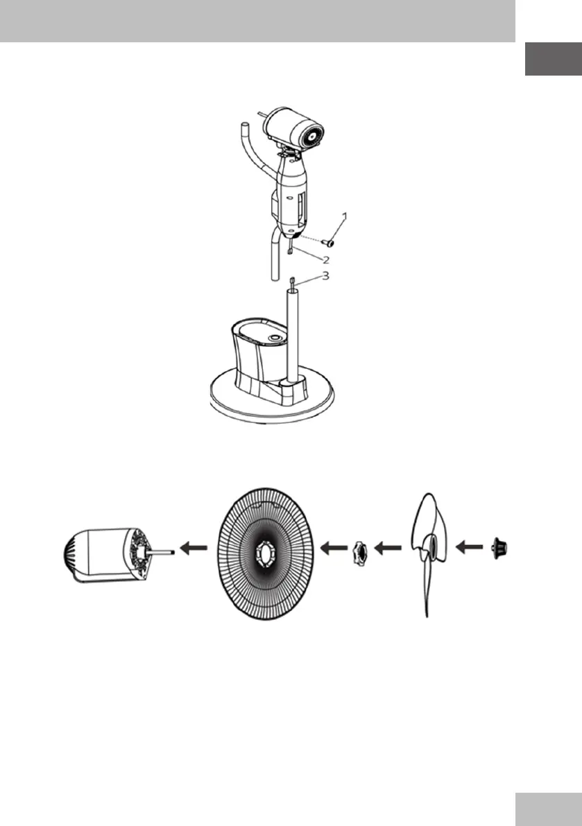 - Instale la rejilla trasera, la tuerca de plástico, las aspas y la fijación de aspas en