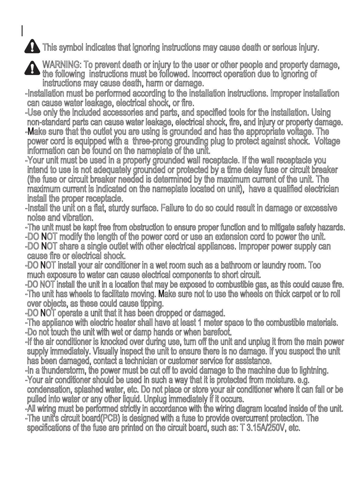 -If the air conditioner is knocked over during use, turn off the unit and unplug it from the main power