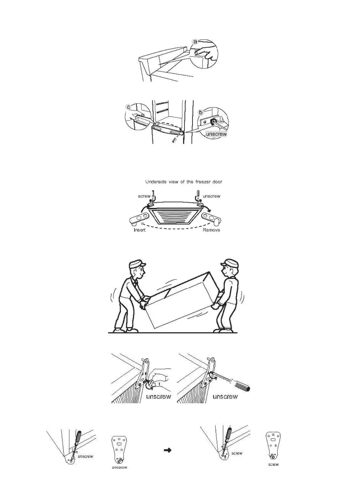 b. Take of the middle hinge by removing the screws. Lift the freezer door up and move it