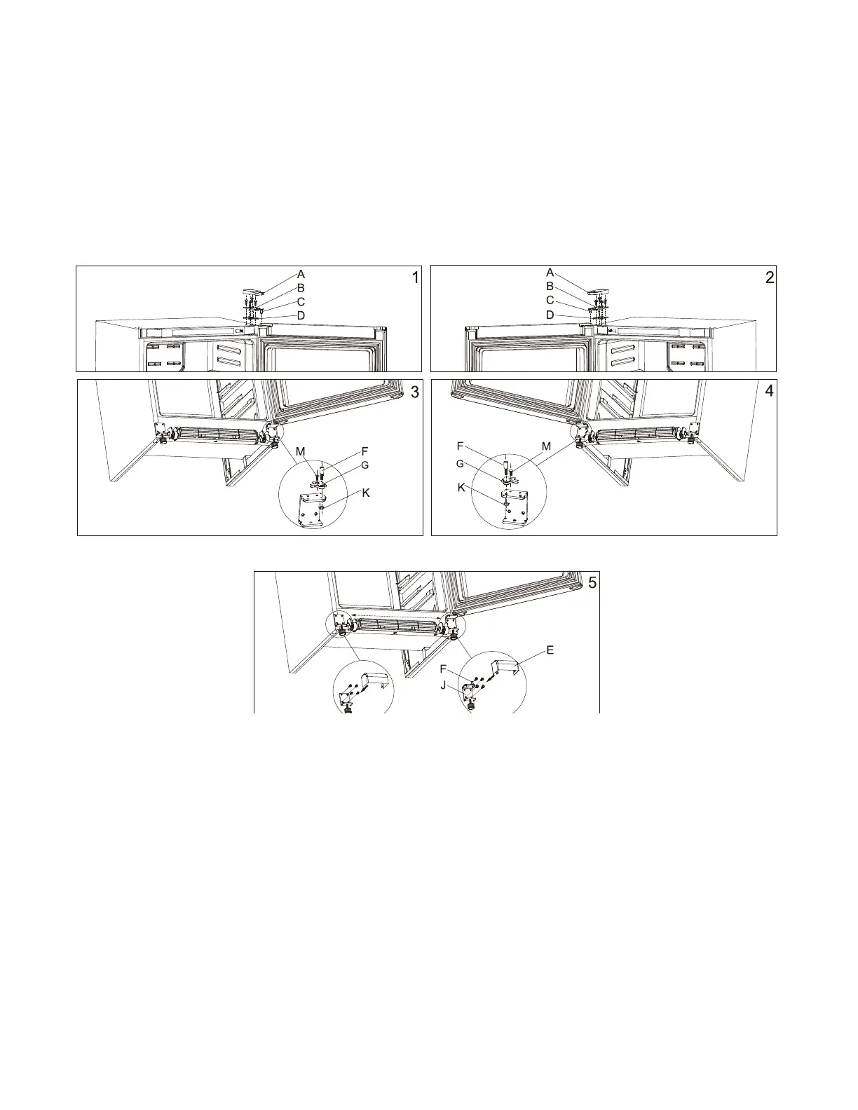 9. Reinstall the door and ensure that the bottom door spindle (F) is placed in the hole in bottom hinge that is closest to