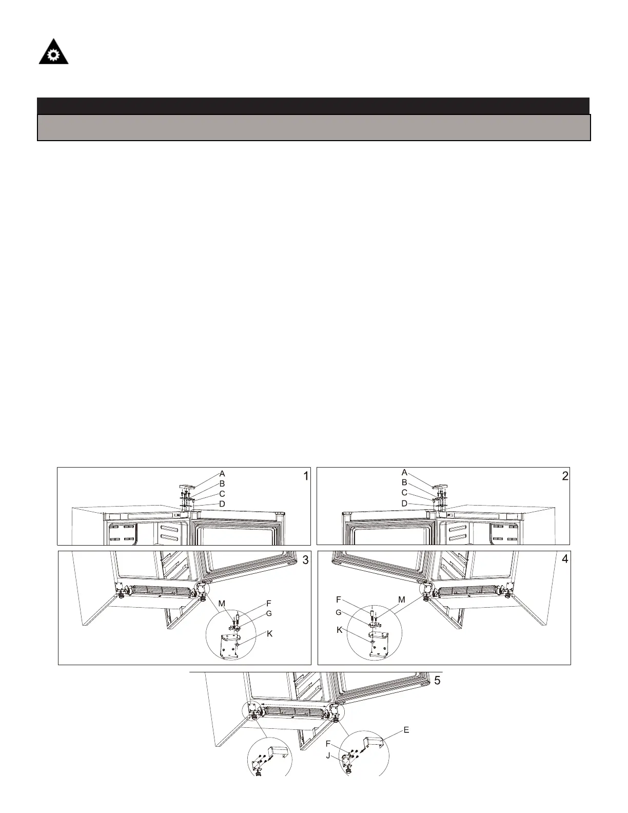 8. Vuelva a instalar la puerta verifi cando que el vástago inferior (F) quede dentro del orifi cio de la bisagra inferior más