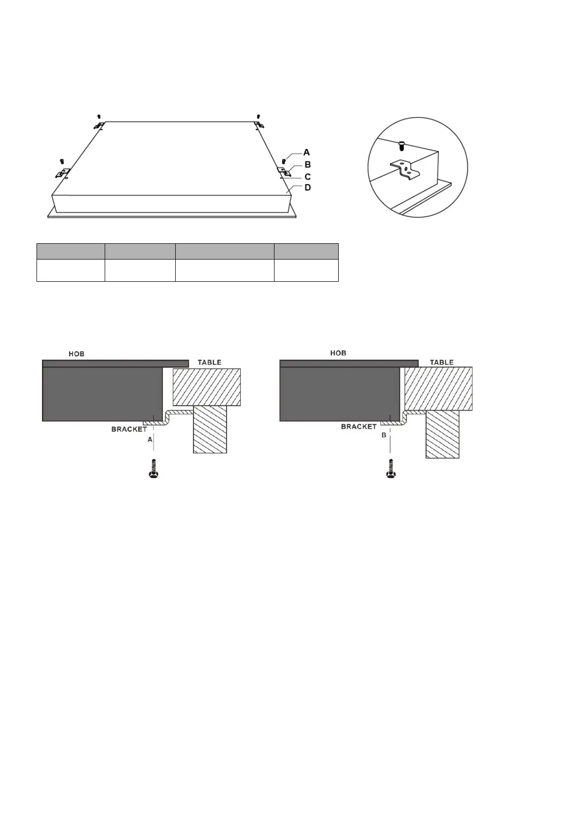 Fix the hob on the work surface by screw four brackets on the bottom of hob (see picture) after installation.