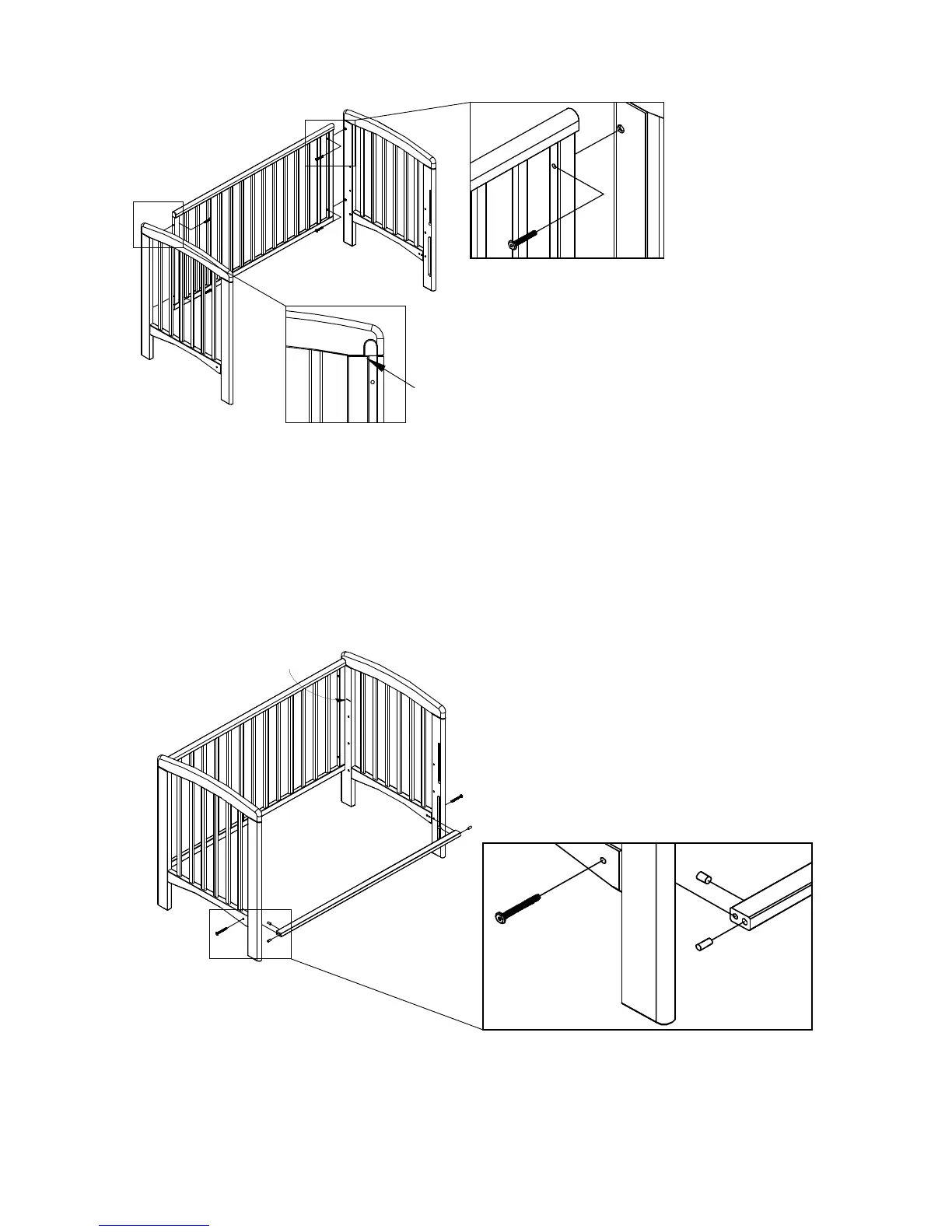 Assemble the fixed side (part B) to the cot ends (part A) using four 50 mm bolts (fixing 1). Note