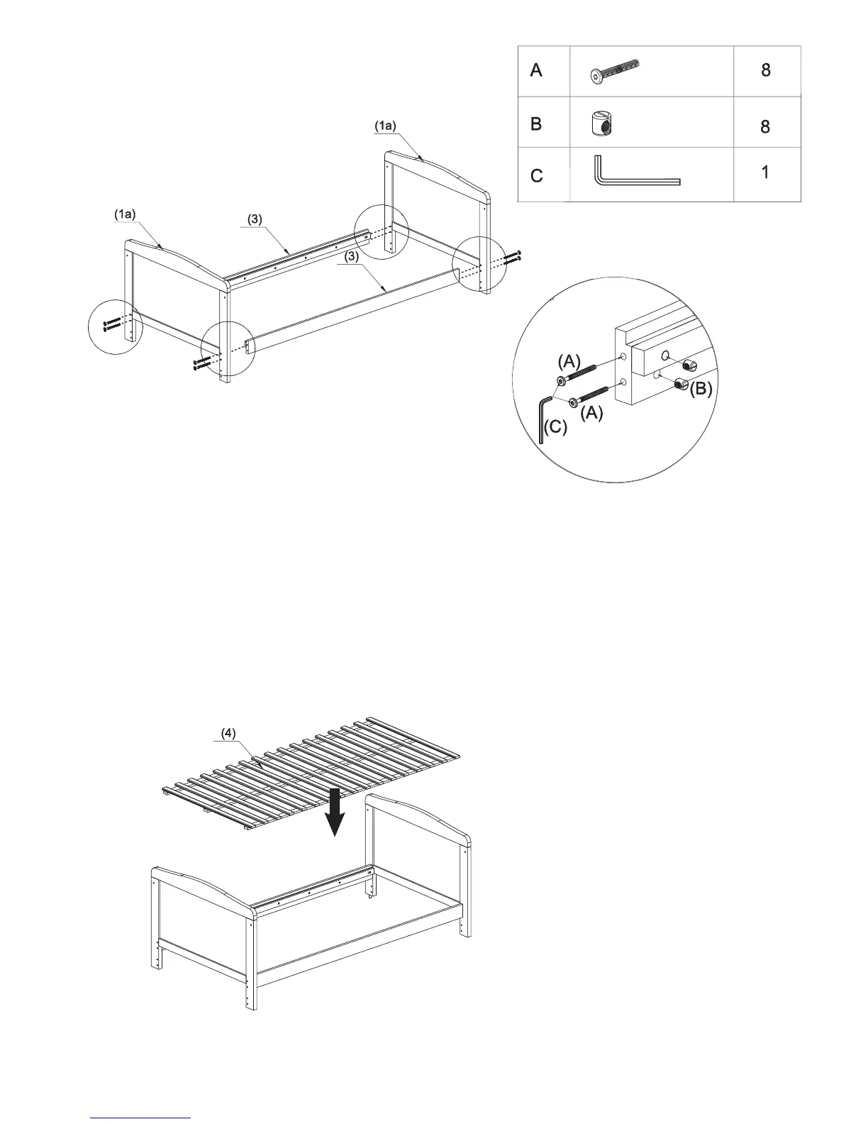 nut (B), place the mattress base (part 4) onto the frame and tighten