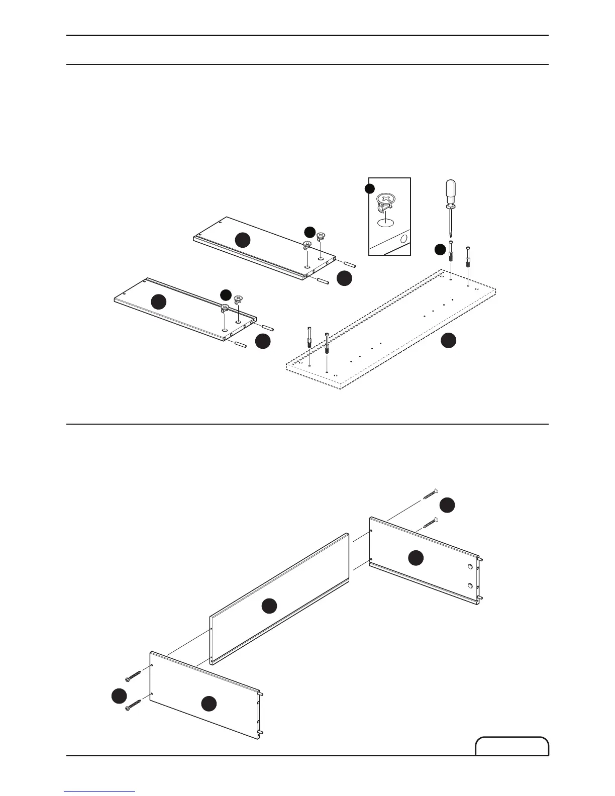Attach 4x metal dowels (A) into the pre-drilled holes on drawer front (7). Use a screwdriver to