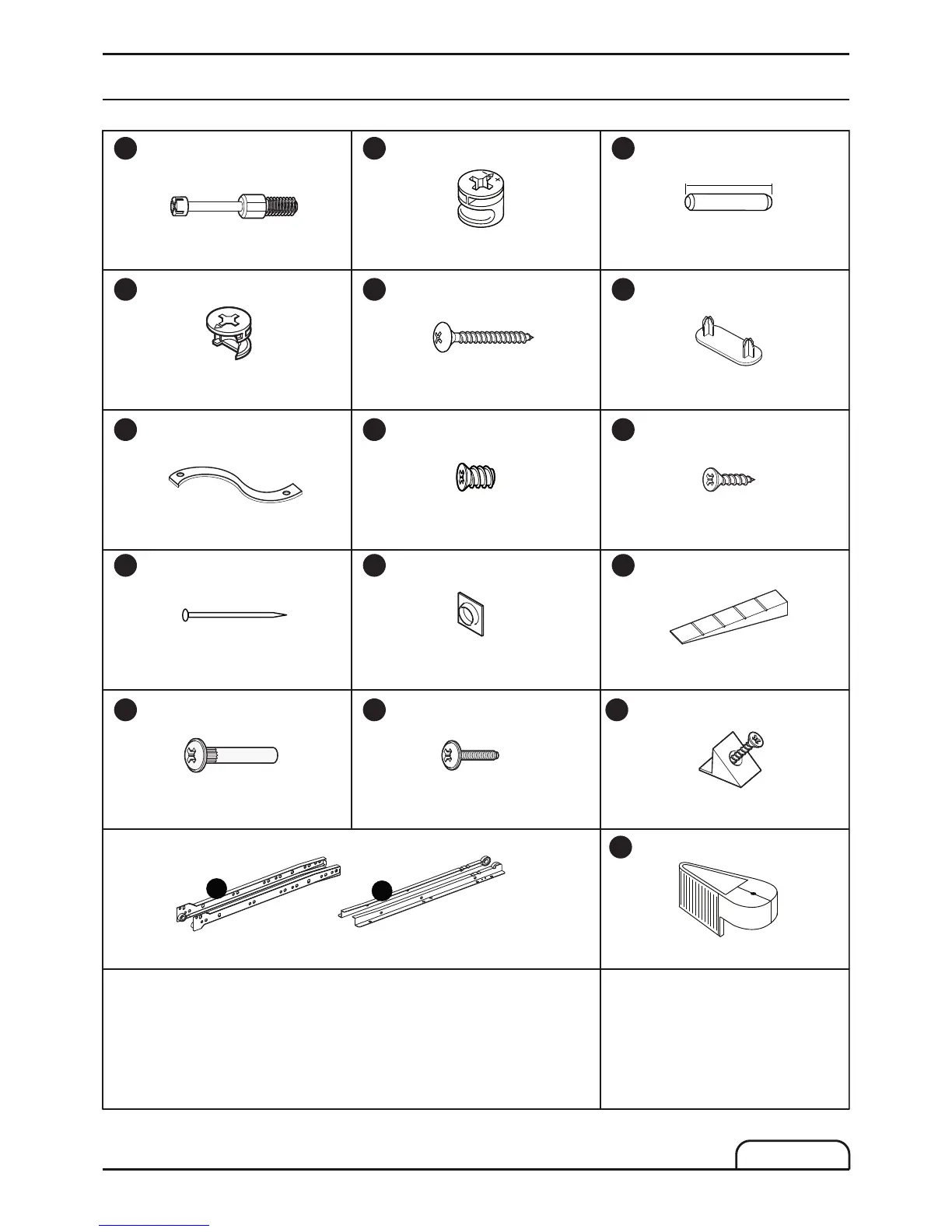 Metal dowel x 24 Long cam lock x 8 Wooden dowel x 24