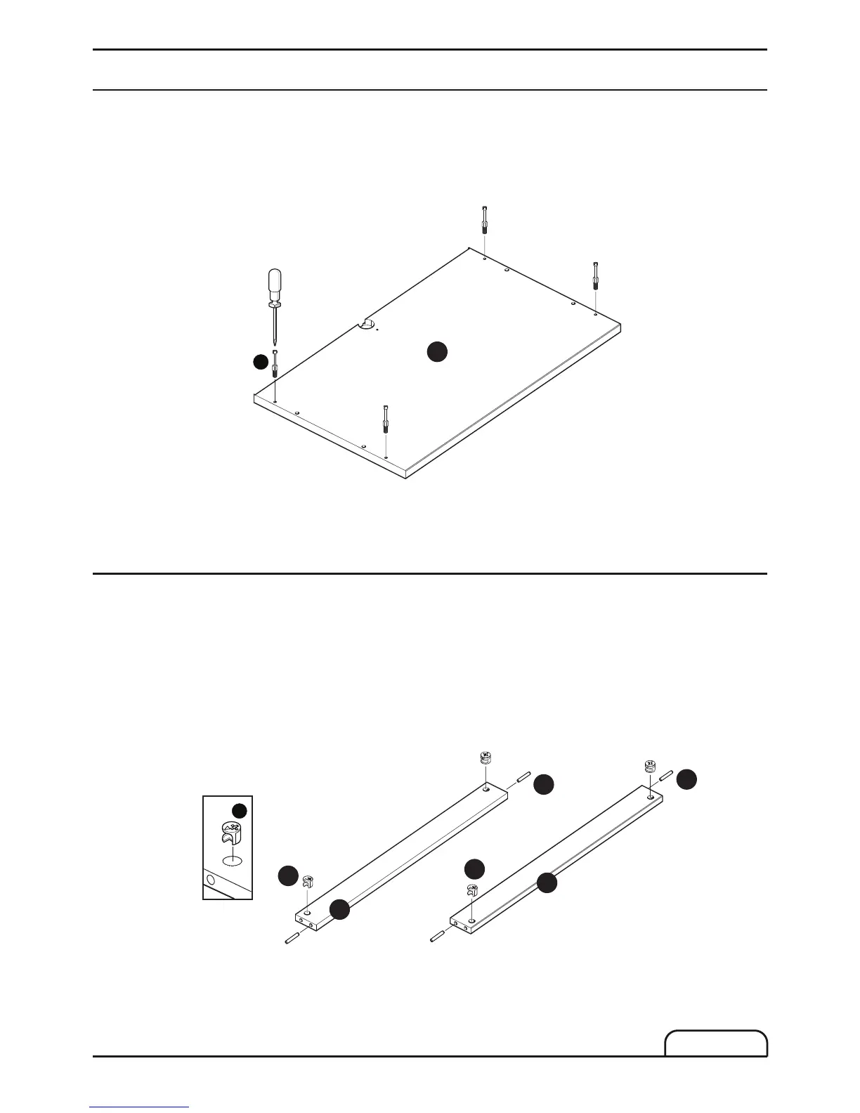 Attach 4x metal dowels (A) into the pre-drilled holes on top panel (1) as shown. Use a screwdriver to turn